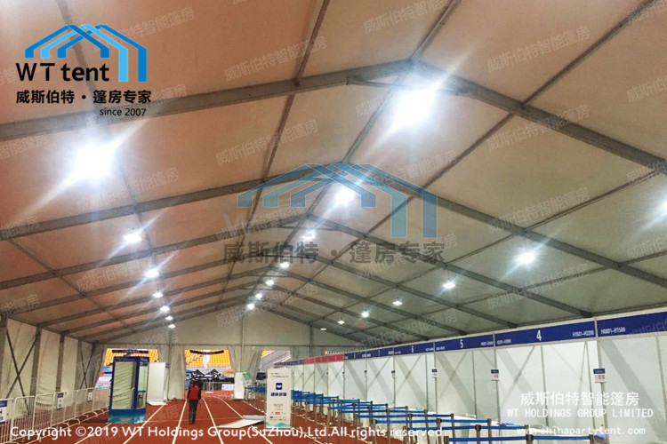 除此之外,室內大型綜合體育館篷房選用的是高強度的鋁合金框架,在戶外可抗8~10級大風;四周可選擇玻璃墻或PVC篷布,篷頂則為防水且阻燃的PVC透明篷布或不透明篷布,。另外,篷布上可以印刷logo吸定制圖案,幫助眾人區(qū)分各類場館。